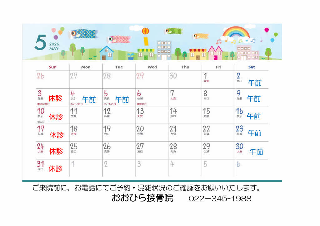令和8年5月 診療カレンダー おおひら接骨院